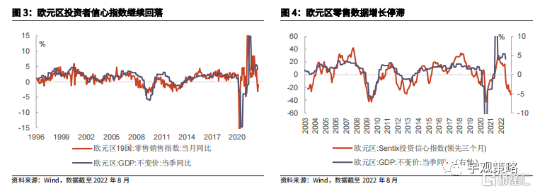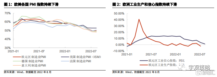 通胀压力导致海外基本面持续收缩。8月美国CPI同比增速8.3%,核心通胀再度上涨,整体回落幅度不及预期;欧元区德国、意大利、西班牙等核心国通胀数据居高不下,8月CPI同比分别录得7.9%、8.4%和10.5%,前值分别为7.5%、7.9%和10.77%。通胀控制不利下,各国央行持续实施货币紧缩政策,欧洲央行9月再次上调三大利率75个基点,美联储9月维持激进加息的预期升温。流动性压力导致欧美经济需求疲软,PMI、工业产值等经济生产指标回落严重。欧元区19国7月工业生产指数最新录得-2.4%,前值2.2%;而工业信心指数8月录得1.2%,前值3.4%。