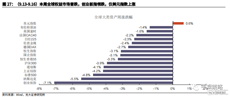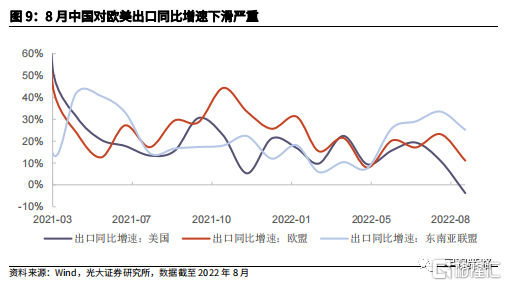 外需疲软导致出口增速下滑。8月中国出口同比增速为7.1%;出口环比增速-5.30%,较上月持续下降并跌入负区间;贸易逆差出现收缩,8月终值793.93亿美元,前值1012.67亿美元。周内中国集装箱综合运价指数(CCFI)和上海出口集装箱综合指数(SCFI)快速回落,八大枢纽港口集装箱外贸吞吐量当旬同比-14.6%。外需走弱是8月出口增速下滑的主要原因,中国对主要出口国的出口增速均出现下滑,其中对美国与欧盟8月出口同比增速分别为-3.77%和11.09%;对东南亚地区出口同比增速相对稳定为25.13%,较7月回落幅度相对较小。