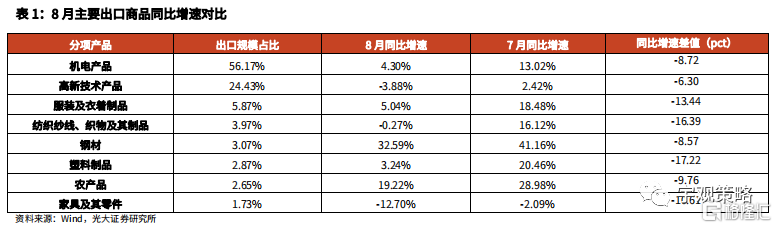 从产品结构来看,轻工业消费品和高新技术产品出现较大回落。我国出口商品主要以轻工业消费品为主,其中机电产品出口规模占比最大,8月占整体规模的比重达56.17%。从增速来看,8月机电产品的出口同比增速为4.30%,较7月下降8.72pct,同样出现增速下滑的主要出口产品还包括服装、纺织、塑料、家具等产品。上述产品同属于劳动密集型的轻工业消费品,其海外订单占总销售订单数比重较高,因此在外需疲软时会出现明显下滑。而高新技术产品的出口规模比重为24.43%,仅次于机电产品。该类产品主要涵盖医药生物、半导体、光伏等产品,具有高附加值特性,整体需求同样受周期影响,8月同比增速最终录得-3.88%,较7月下降6.30pct。
