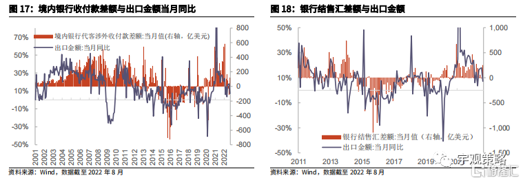 外需回落时,境内企业将美元外汇兑换成人民币的活动减少,人民币因需求减少而承压。外需回落时,贸易顺差将有所减少。境内企业获得的美元外汇减少,将美元外汇兑换成人民币的需求也将减少。相应的,衡量跨境资本资金流动的境内银行代客涉外收付款差额及银行结售汇差额也随之减少。因此人民币贬值压力有所增加。