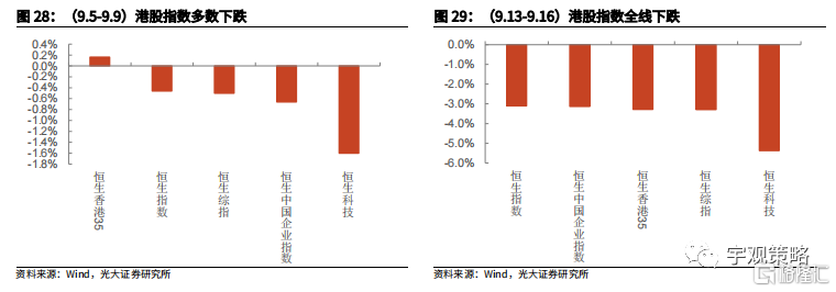 港股来看,短期存在估值修复的空间,长期走势仍然取决于基本面。整体来看, 8月各项经济扶持政策出台后,经济基本面在三季度有望持续恢复。另一方面剔除新经济后,港股的PE及PB估值均处于2002年以来的历史低点,估值分位数也位于近几年的较低水平。随着各项利空因素基本落地,港股短期存在一定的估值修复空间,8月末的反弹可能持续。长期来看,港股修复的高度和持续性仍取决于中国经济的拐点及改善程度。行业方面建议关注:1)受益于经济扶持政策及货币宽松的地产、基建、物业在内的稳增长行业;2)中美审计合作前景下,退市风险有望缓解的互联网科技公司。