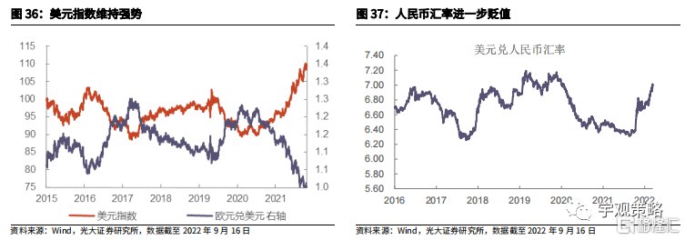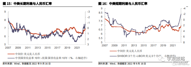 未来随着中国出口景气度继续下滑以及中美短期利差维持在低位,人民币汇率大概率将继续承压。美国通胀高企,因此短期美联储将持续加息,市场预期在2023年3月后才会开始降息。因此中美短期利差将继续维持低位,甚至有进一步回落的可能。在此情况下,随着欧美经济景气度下行,中国的出口增速将继续放缓,为人民币汇率带来负面影响,人民币将继续维持低迷。