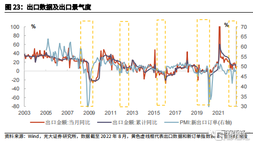 2003年以来我国共经历了5轮外需回落的周期,时间长度在9个月到1年左右。我们结合出口金额及PMI新订单指数综合判断外需情况。发现在2008年9月到2009年8月、2011年12月到2012年12月、2015年6月到2016年3月、2019年1月到2020年2月以及2022年1月至今这五个时间段,出口数据和新出口订单景气度全面下滑。