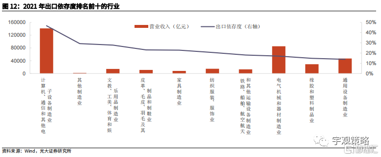 从行业构成来看,半导体、电子、机械设备等行业在外需回落时面临营业收入回落的风险。出口规模占比排名前十的行业中,出口依存度最高且营收规模最大的是计算机、通信和其他电子设备制造业,其2021年出口交货值占全年营业收入的46.72%。该行业主要以对高附加值产品的加工贸易为主,与全球产业链结合紧密,因此外需回落对该行业的冲击最为明显。而电气机械和器材制造业以及通用设备制造业的营业收入规模仅次于计算机、通信和其他电子设备制造业,其进口依存度分别为16.97%和13.88%,外需回落下新订单数量大幅减少将导致该行业同样面临景气度下滑的冲击。整体来看,出口依存度排名前十的行业主要集中在工业制造业板块,包括半导体、电子、机械设备制造在内的相关行业四季度可能面临业绩承压。