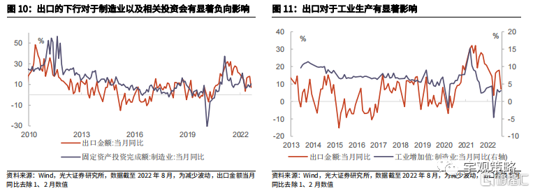 同时出口增速下行对于国内制造业可能带来显著的影响。虽然目前出口对于国内GDP贡献已经显著降低,但其对于制造业的拉动仍然非常明显。历史来看,出口景气度与制造业增加值以及制造业投资都有直接的关系。而2020年之后出口数据的高增也是制造业景气的重要支撑。若未来出口数据出现显著下行,制造业景气度与投资数据恐怕将面临明显的下行压力。