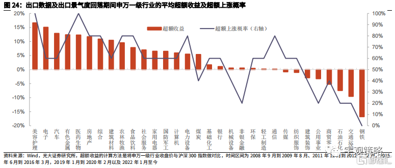 总结来看,在外需回落期间,中国经济将进一步承压,但市场走势的关键在于整体的经济景气度水平。若后续房地产风险得到缓解,地产销售逐步回暖,即使出口数据下滑,A股和港股仍然受到支撑。 行业方面,商贸零售、纺织服饰、轻工制造、机械设备等下游工业制造业和轻工业消费品在外需回落期间表现不佳。相对来看,美容护理、医药生物、房地产、建筑材料、农林牧渔、食品饮料等与外需相关度不高的行业容易取得较好的表现。