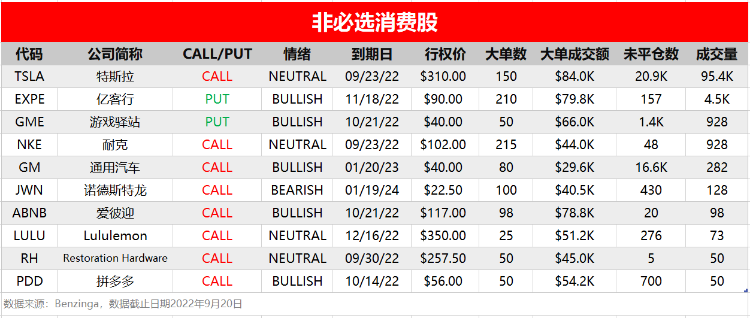 重点动态:特斯拉出现末日看涨期权异动大单,9月23日到期、行权价310美元,该期权链当日成交近十万张,近两日成交量大幅提升。拼多多于10月14日到期、行权价56美元的看涨期权出现异动大单,成交50张,总成本5.42万美元,该看涨期权近三个交易日开始成交,行权价低于当前股价。