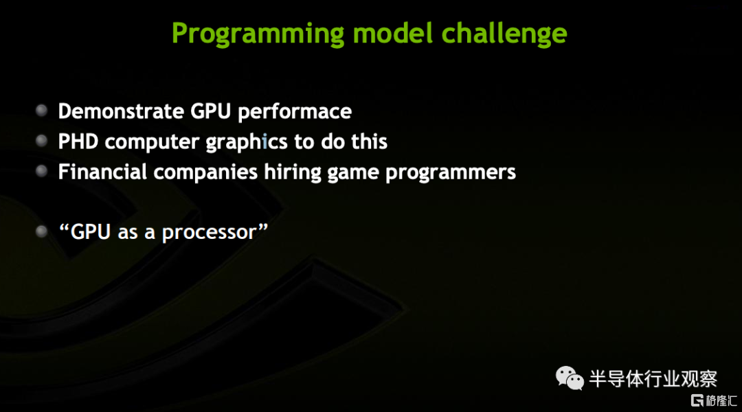 有行业从业人士告诉笔者,之所以英伟达会推出CUDA,是因为从十几年前开始,英伟达就一直吹嘘GPU是最强的计算平台,业界其实也对茨表示认可。但由于非常难编程,很少有开发者能够将其计算能力放大,也没能吸引更多码农的注意。英伟达CUDA项目的领导者Ian Buck也曾经在一次讲演中也曾用一张图分享了当时GPU编程的挑战。
