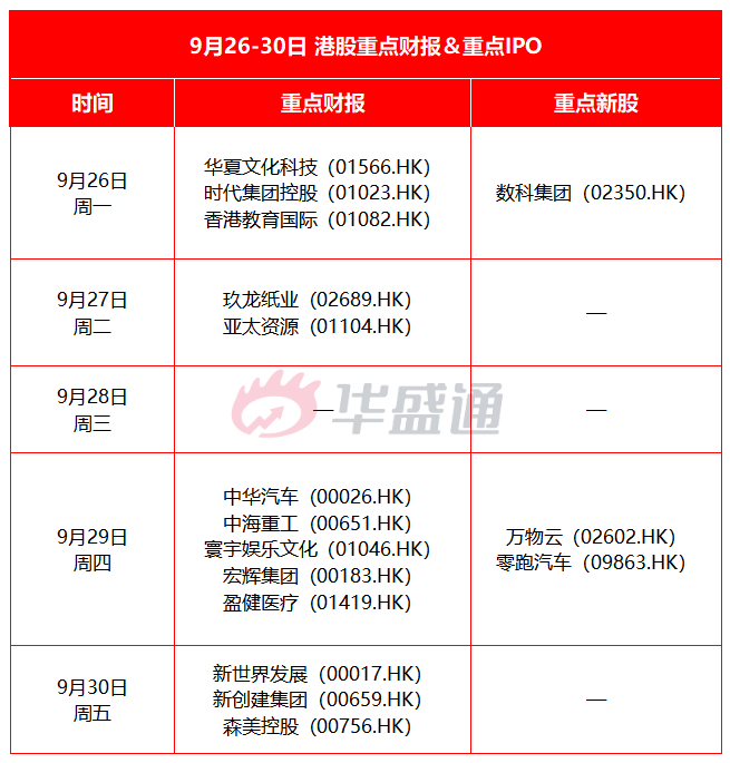 下周有部分港股公司财报将发布,关注时代集团控股、玖龙纸业等;新股方面:下周一数科集团上市,周四万物云、零跑汽车上市。