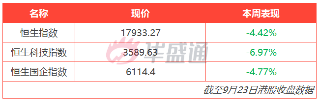 恒生指数本周跌4.42%,报17933.27点;恒生科技指数本周跌6.97%,报3589.63点;国企指数本周跌4.77%,报6114.4点。