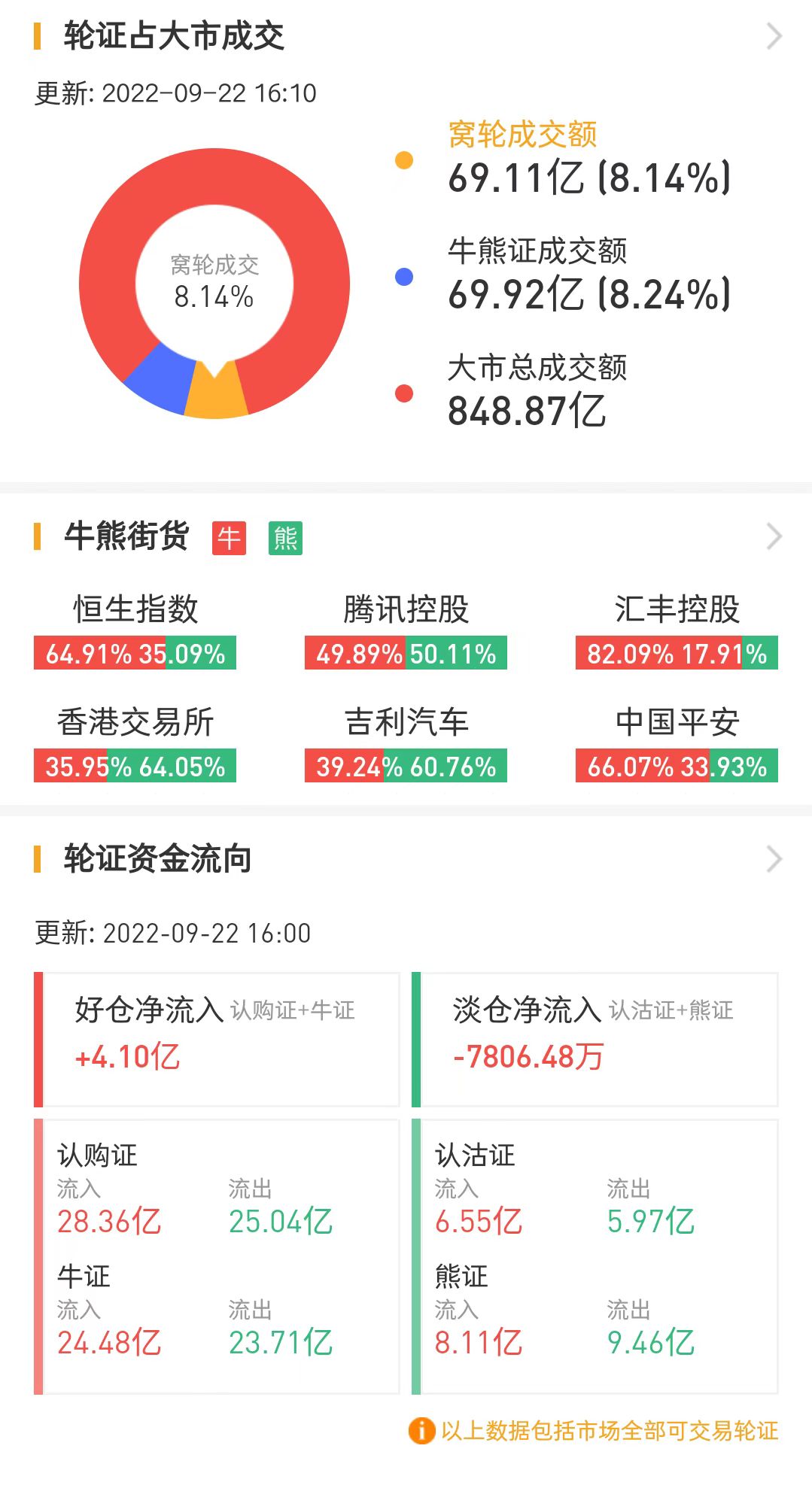 其中,窝轮总成交额为69.11亿港元,牛熊证总成交额为69.92亿港元。