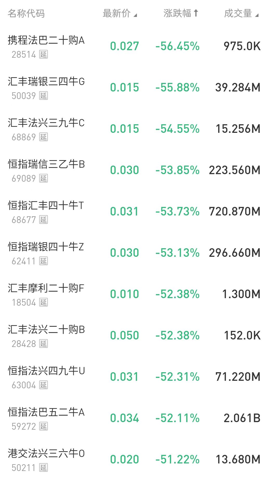 在今日跌幅榜中,携程法巴二十购A $28514.HK 跌56.45%;汇丰瑞银三四牛G $50039.HK 跌55.88%。