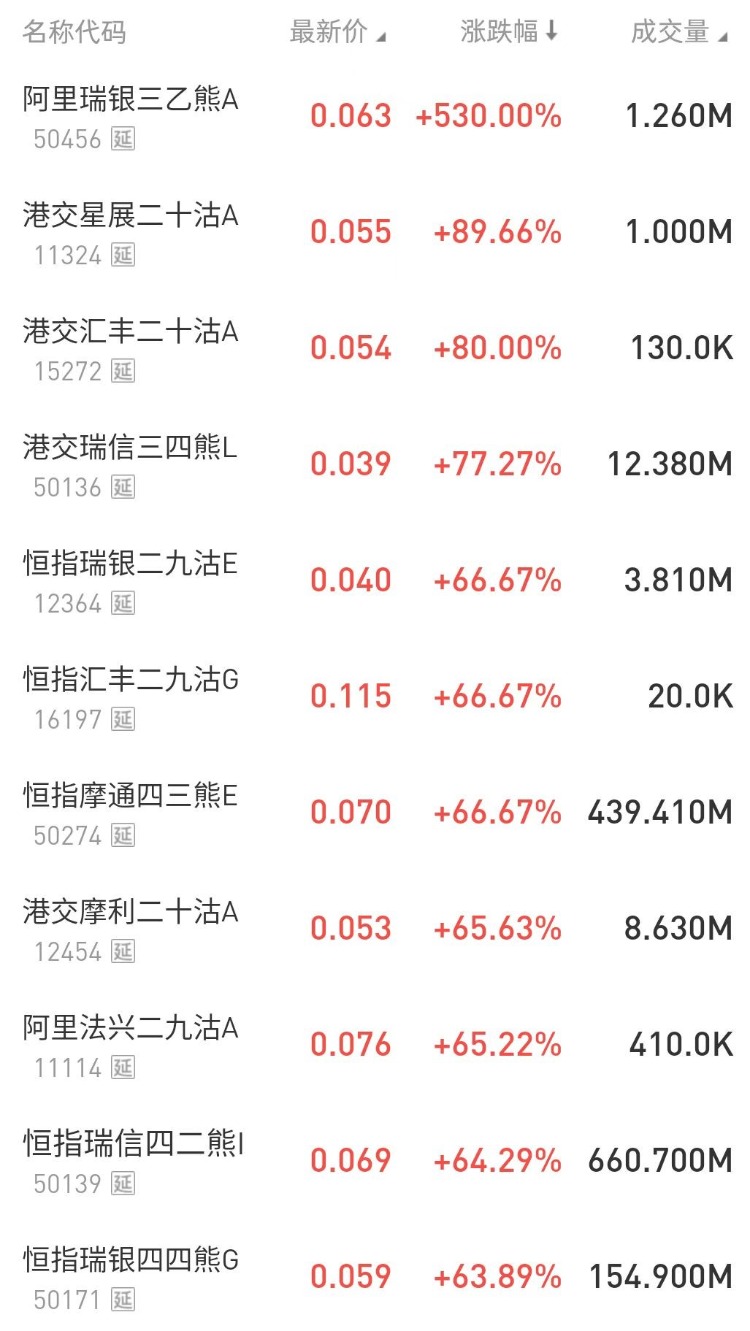 在今日涨幅榜中,阿里瑞银三乙熊A $50456.HK 涨530%,港交星展二十沽A $11324.HK 涨89.66%,此外,恒指瑞银二九沽E $12364.HK 涨66.67%。