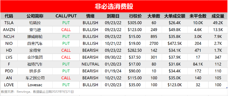 重点动态:美联储加息节奏下,新能源车板块大跌,蔚来汽车隔夜大跌10.34%报18.3美元,于10月21日到期、行权价19美元的看跌期权出现异动大单,成交2700张,总成本47.2万美元,为当日该期权链主要贡献者。