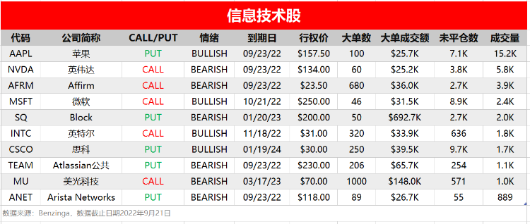 周三(9月21日),非必选消费、信息技术和通讯服务股相关个股出现较多活跃单,按照当日成交量排行,榜单TOP 10分别如下:
