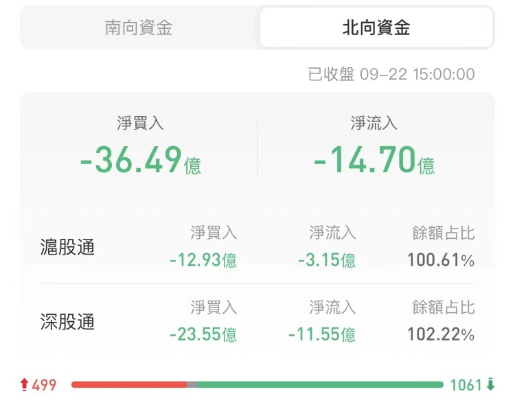 北上资金今日净卖出36.49亿元,沪股通净卖出12.93亿元,深股通净卖出23.55亿元。上一交易日净卖出30.60亿元。