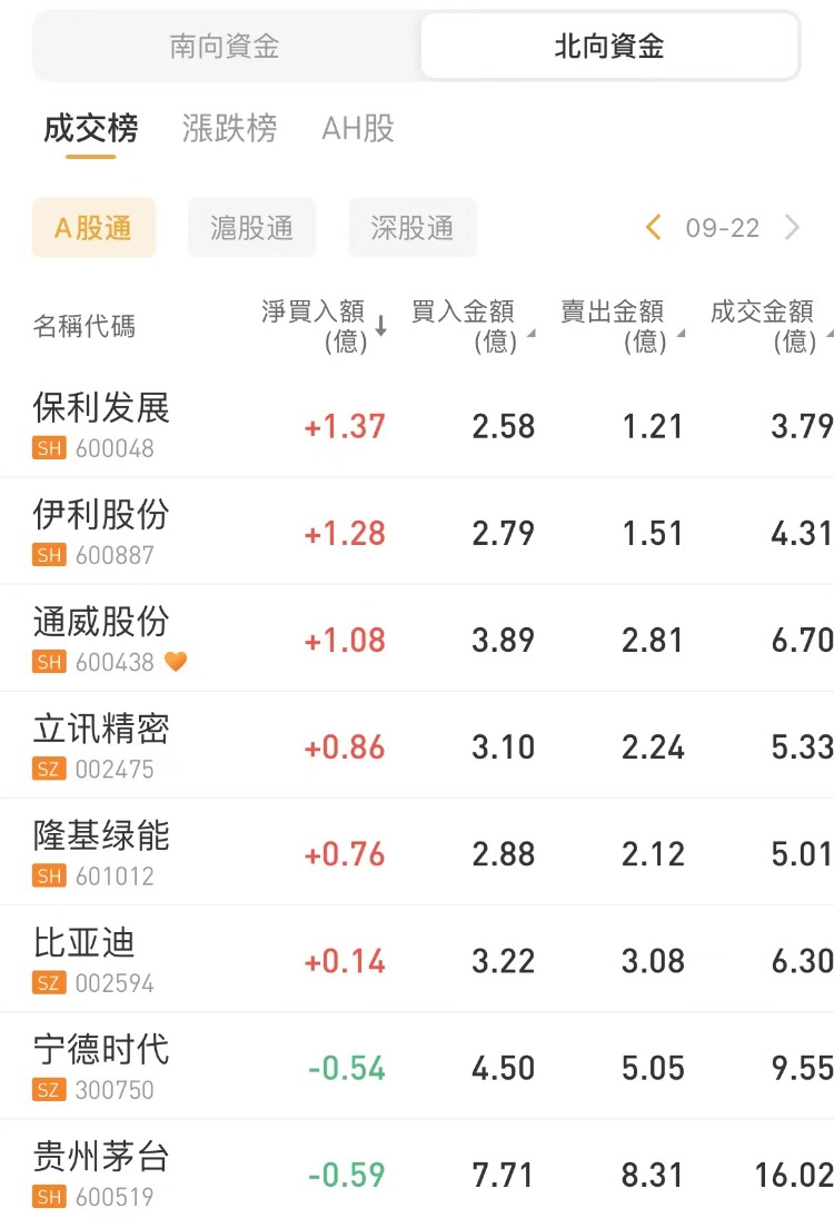 北上资金今日净买入保利发展1.37亿元,为今日买入之最;净买入伊利股份1.28亿元。