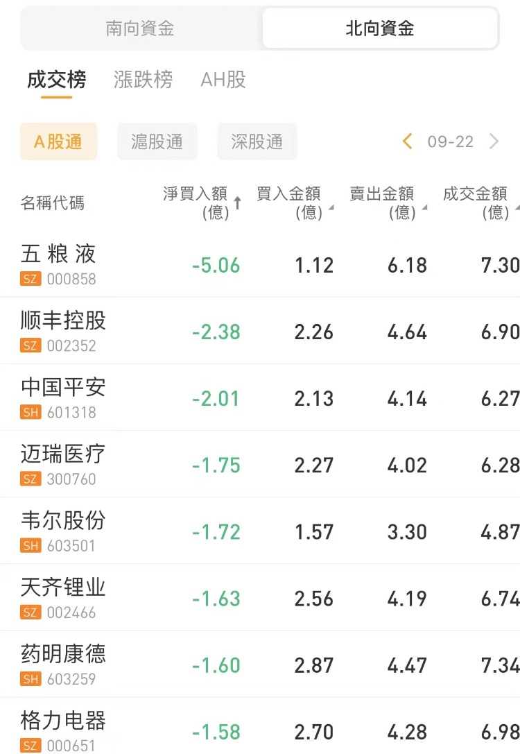 今日北上资金净卖出五粮液5.06亿元,顺丰控股遭净卖出2.38亿元。