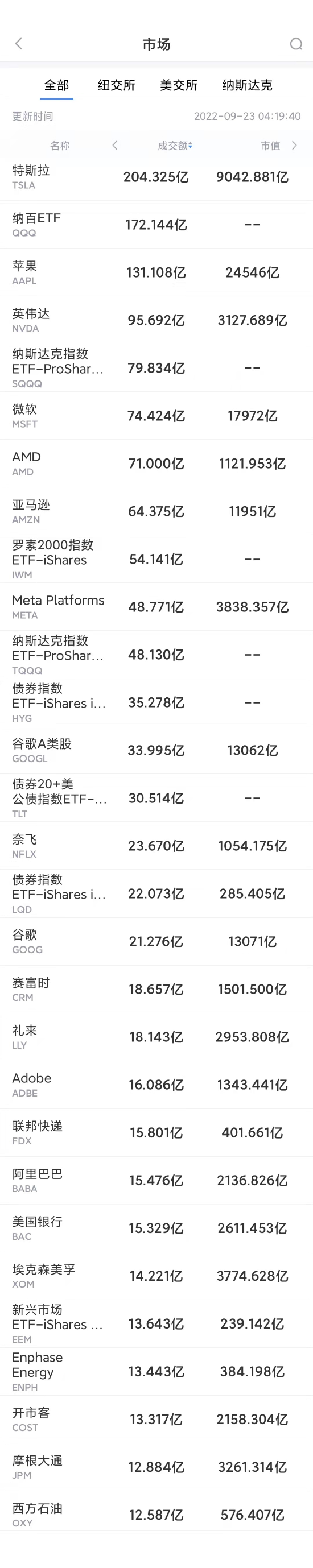 以下为美股当日交易最活跃的20只股票(按成交额):
