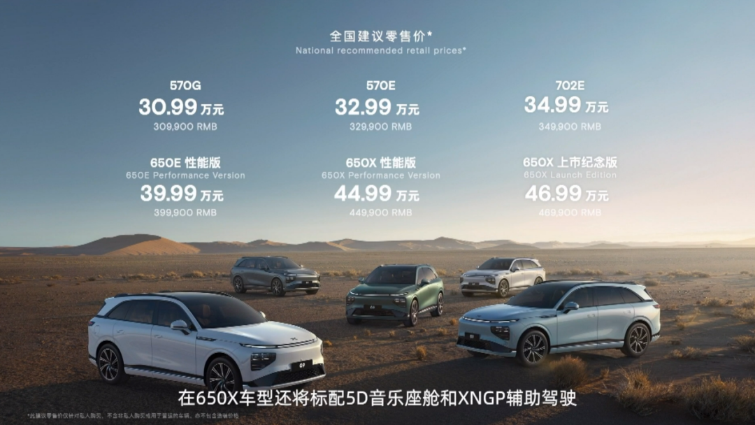 G9共有570G 30.99万元、570E 32.99万元、702E 34.99万元、650E性能版 39.99万元、650 X性能版44.99万元、650 X上市纪念版46.99万元,共六款车型。可选服务:5D音乐座舱2.2万元,XNGP辅助驾驶2.8万元,4C超快充电池包1万元。