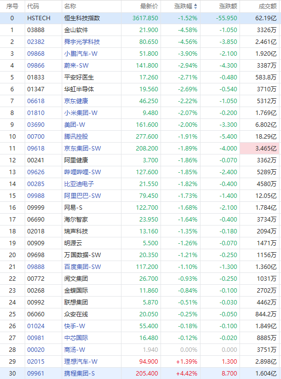 携程集团-S逆势涨升4%领涨成分股,科网股集体下跌,美团-W跌超2%,腾讯控股、京东集团-SW、阿里巴巴-SW跌近2%。