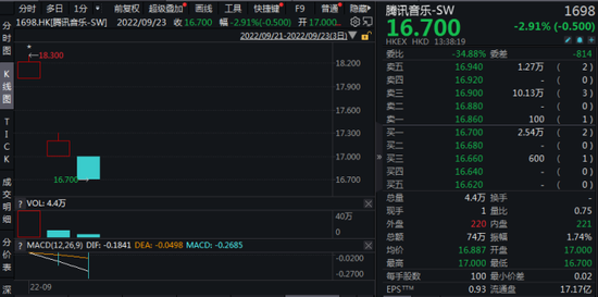 腾讯音乐继续走低,现报16.7港元/股,下跌2.91%,该日跌势较其美股跌幅更甚。