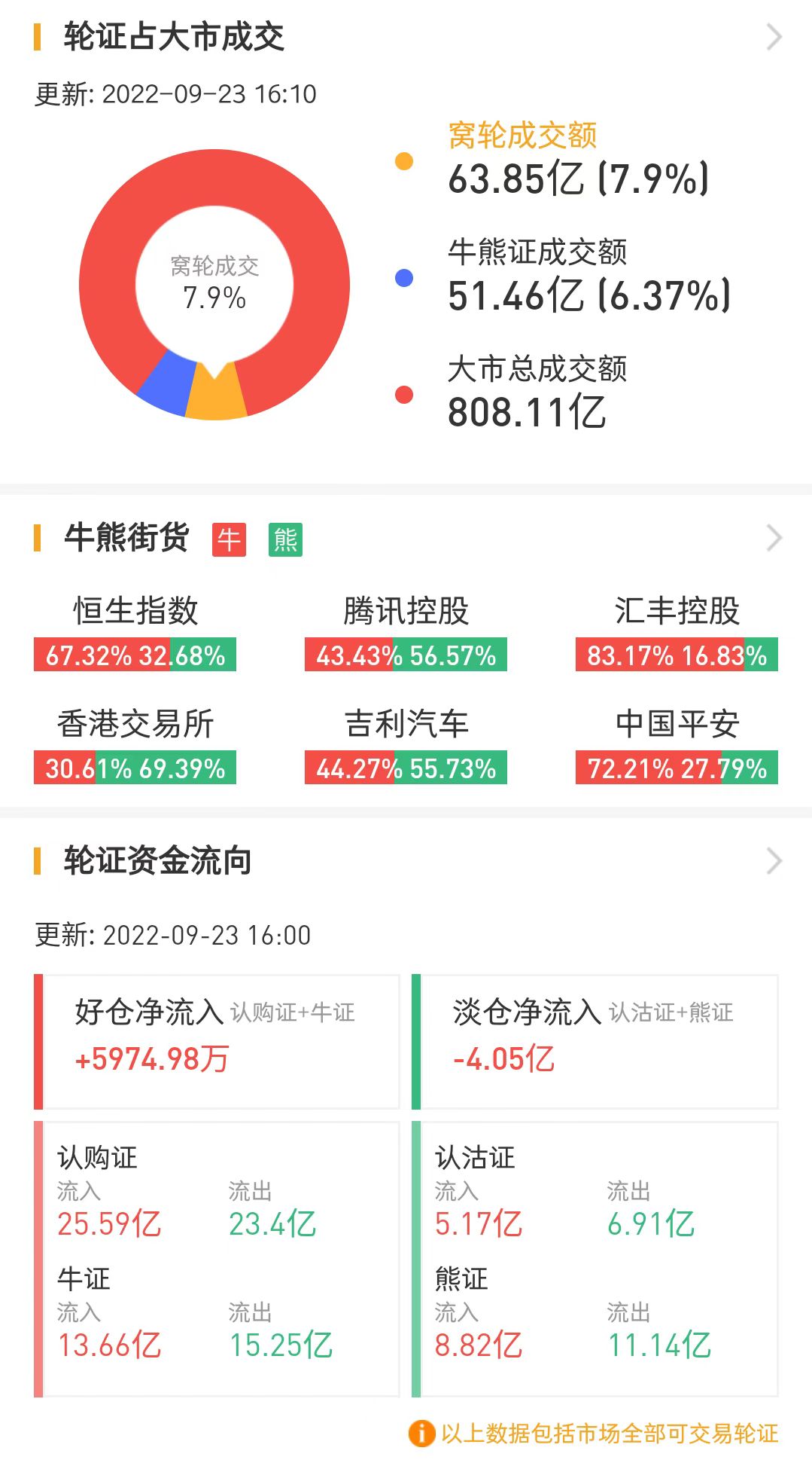 其中,窝轮总成交额为63.85亿港元,牛熊证总成交额为51.46亿港元。