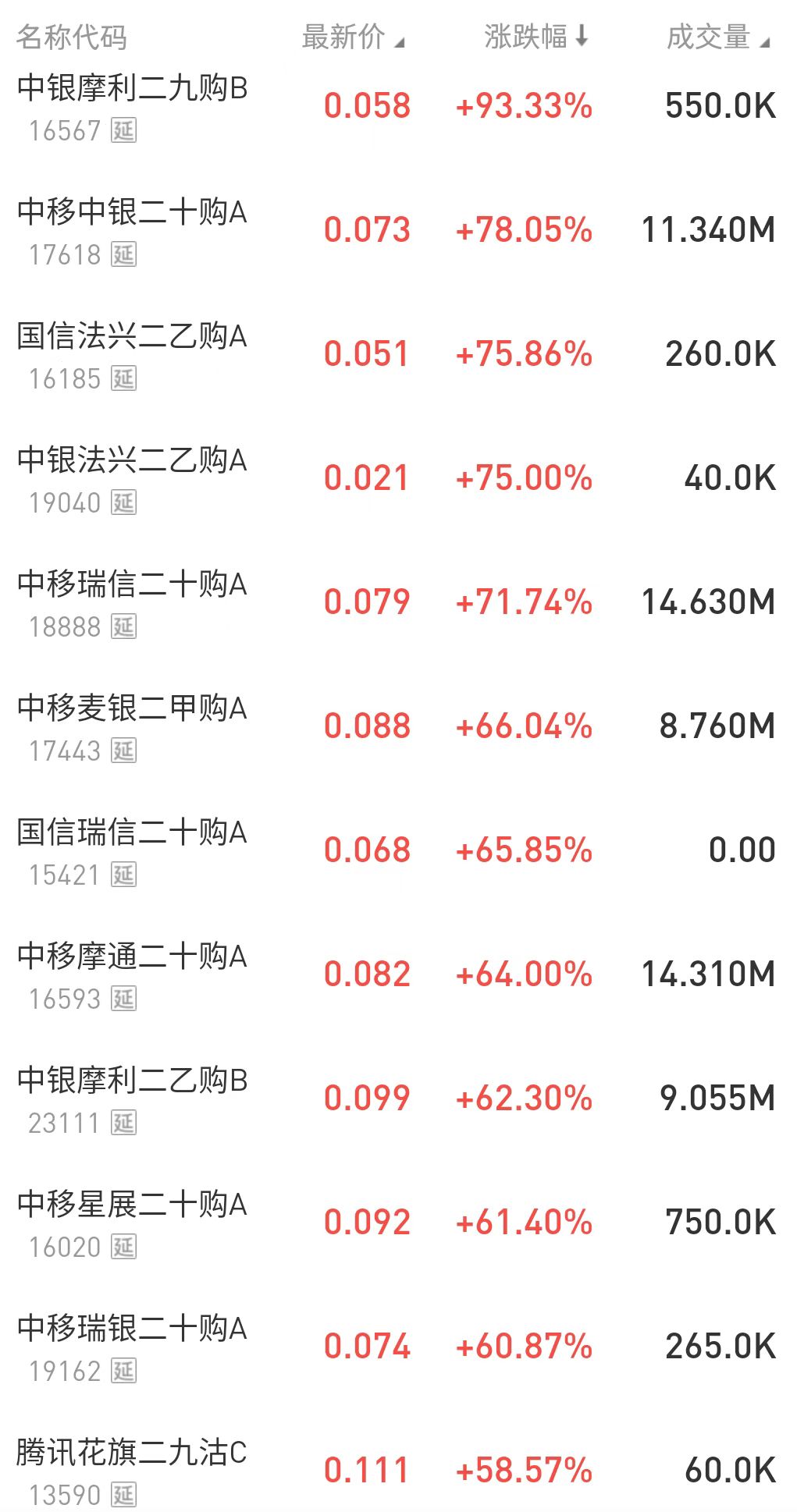 在今日涨幅榜中,中银摩利二九购B $16567.HK 涨93.33%,中移中银二十购A $17618.HK 涨78.05%,此外,国信法兴二乙购A $16185.HK 涨75.86%。