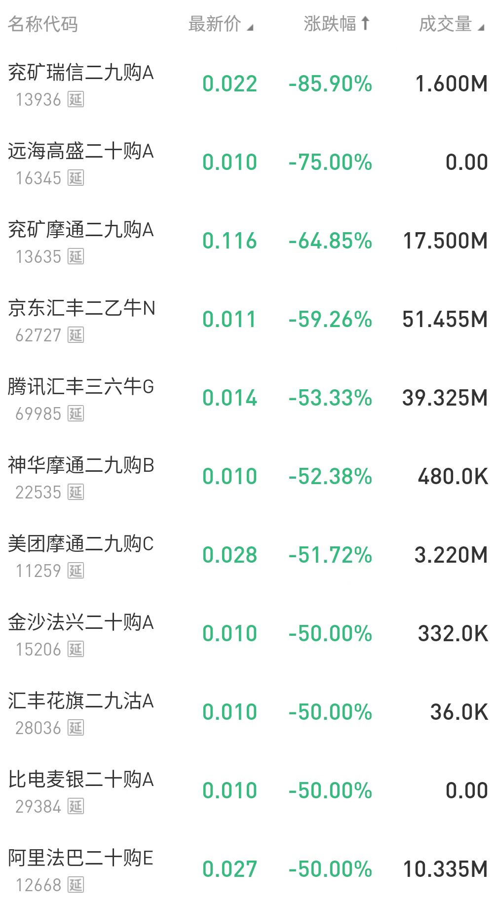 在今日跌幅榜中,兖矿瑞信二九购A $13936.HK 跌85.9%;京东汇丰二乙牛N $62727.HK 跌59.26%。