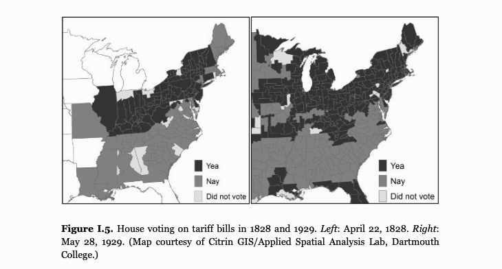 △ 左图:1828年关税投票表决结果分布;右图:1929年关税法案态度地域分布(来源:Douglas Irwin)
