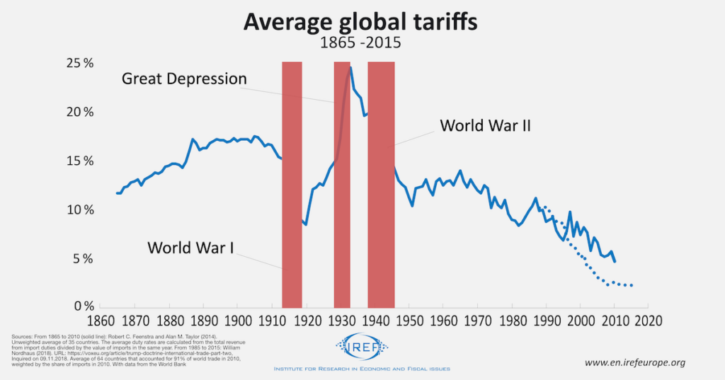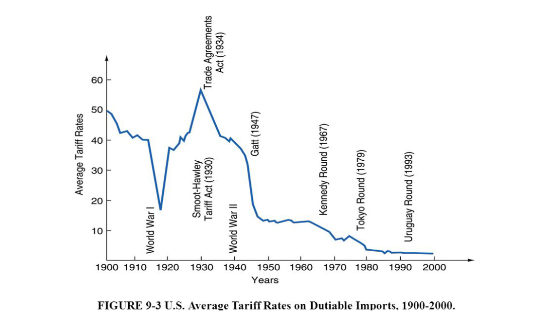 美国平均关税水平在第一次世界大战期间(1914年-1918年)大幅下降,在战后却急剧飙升。于1930年出台的Smoot–Hawley关税法案创下美国史上位列第二的关税水平记录,仅次于1828年的“可憎关税法案”。