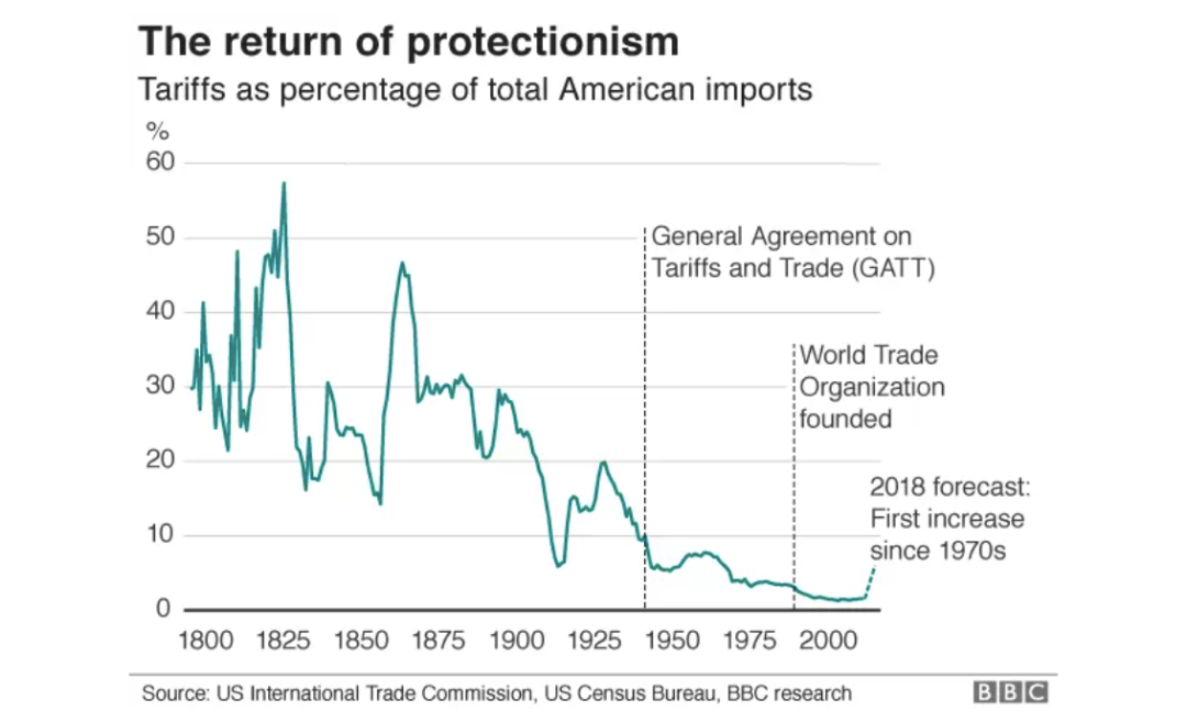 △ 1800年-2000年美国平均进口关税(来源:BBC)