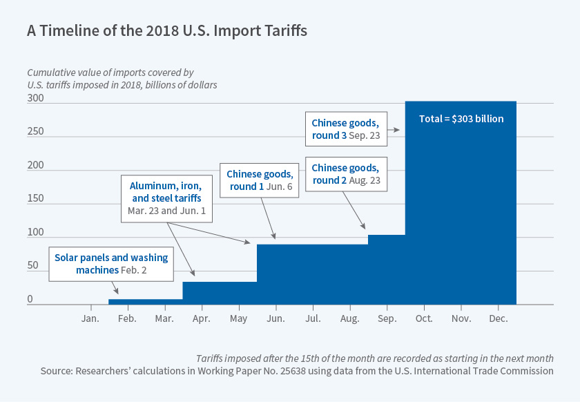 National Bureau of Economic Research在两份工作文件中分析了这场“贸易战”如何影响美国家庭和企业。Mary Amiti等学者认为,高企的进口税率将成本通过上涨的物价转嫁给美国企业与消费者,受到最大冲击的并非海外出口商——美国实际收入由此每月减少约14亿美元,这意味着通货膨胀率的急剧攀升。Pablo D. Fajgelbaum等学者估计这一关税制度使美国进口缩水32%,而来自其他国家的报复性关税导致美国出口下降 11%。