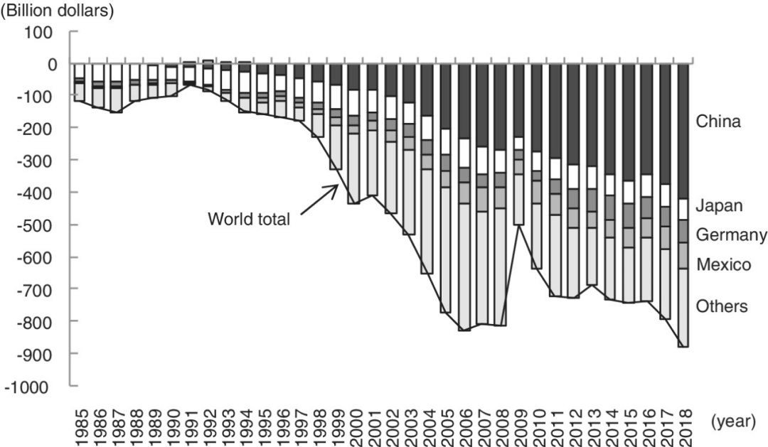 △ 1985年-2018年美国贸易赤字结构(来源:Kwan, C.)