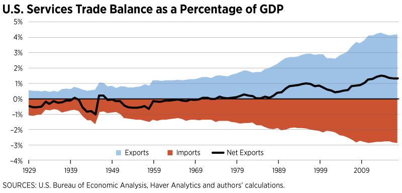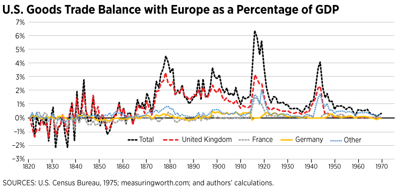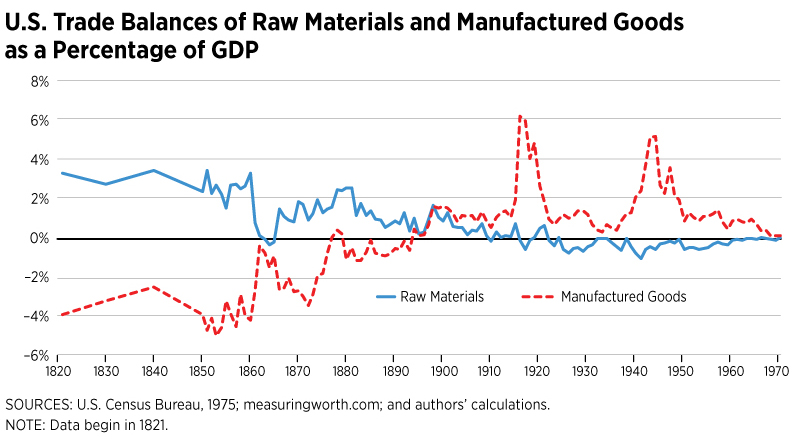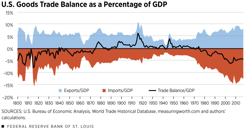 Federal Reserve Bank of St. Louis曾于2020年提出,美国贸易平衡状况似乎与该国工业化阶段密切相关,“许多美国人担心美国目前的贸易逆差规模。然而,存在较大的贸易逆差才是美国历史的主流”。1800年至1870年,美国在除三年外的所有时间中都存在贸易逆差,贸易差额平均约为占GDP比重约–2.2%;从1870年到1970年的100年间,美国维持贸易顺差,这一占比提升至1.1%。自70年代起——正值两次石油危机,美国再次出现贸易逆差,该现象持续至今。