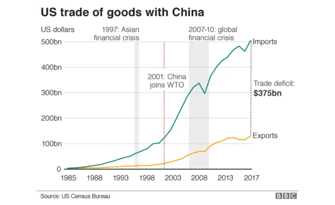 △ 自1985年起至2018年贸易摩擦前夕美国对华进出口贸易逆差持续扩大(来源:BBC)