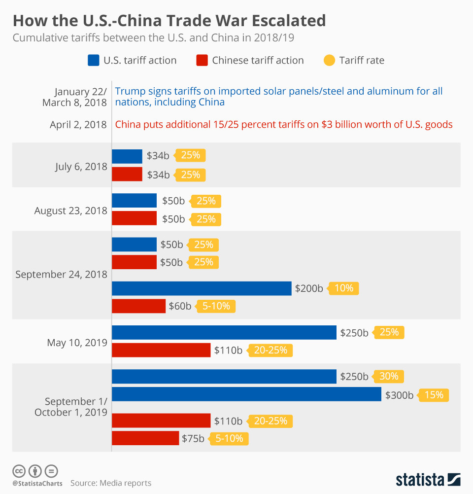 △ 2018年中美在贸易摩擦中征税商品规模及税率(来源:Statista)