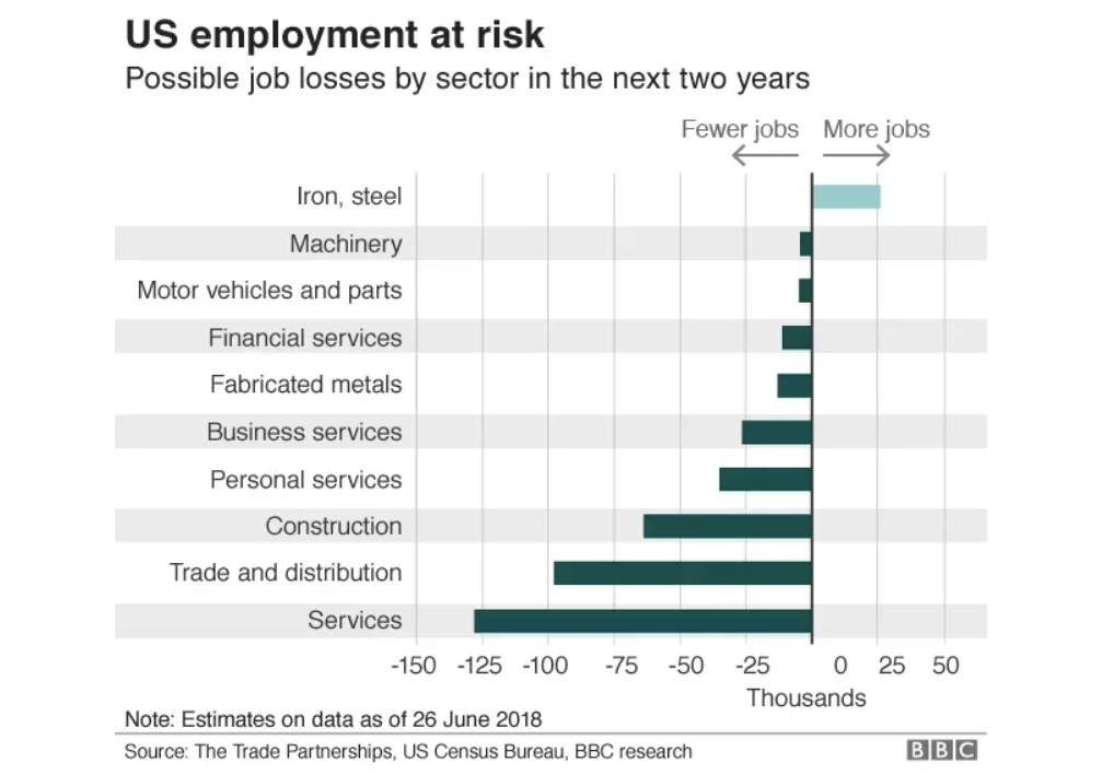 △ 截至2018年6月,“贸易摩擦”导致美国岗位流失产业结构及规模预估(来源:BBC)