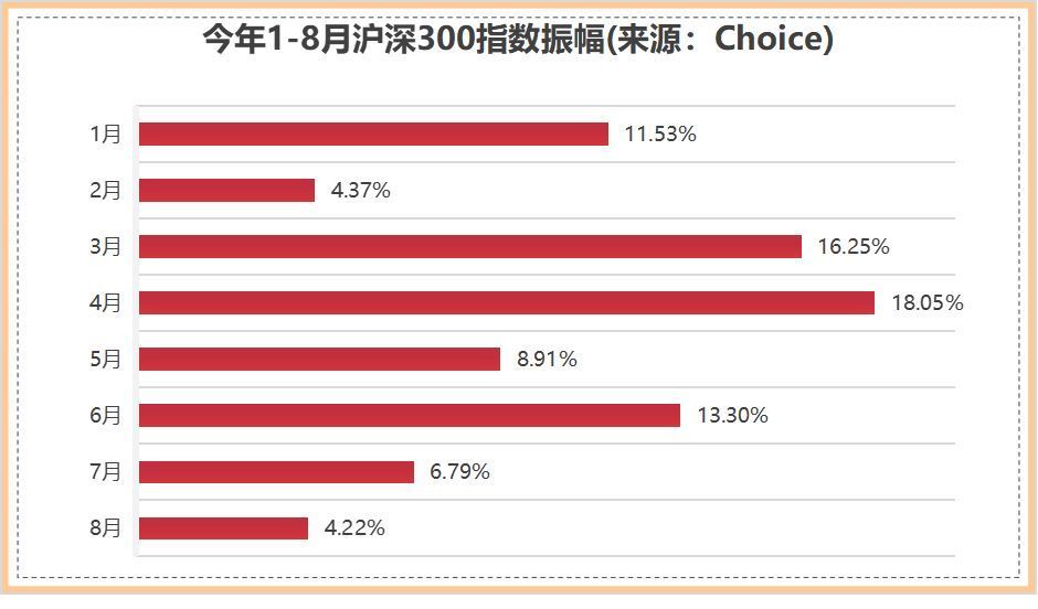 8月的A股在多种不确定性的扰动下呈现出弱势震荡的局面,沪深300整月下跌2.19%,今年1-8月的跌幅随之拉大至17.44%。但从波动角度看来,8月沪深300的振幅仅为4.22%,竟低于有春节假期影响、交易日较少的2月,为今年以来的月度最低值。同时,伴随着市场成交量的缓步下降,折射出避险需求上升所导致的较为低迷的交投氛围与多头信心。