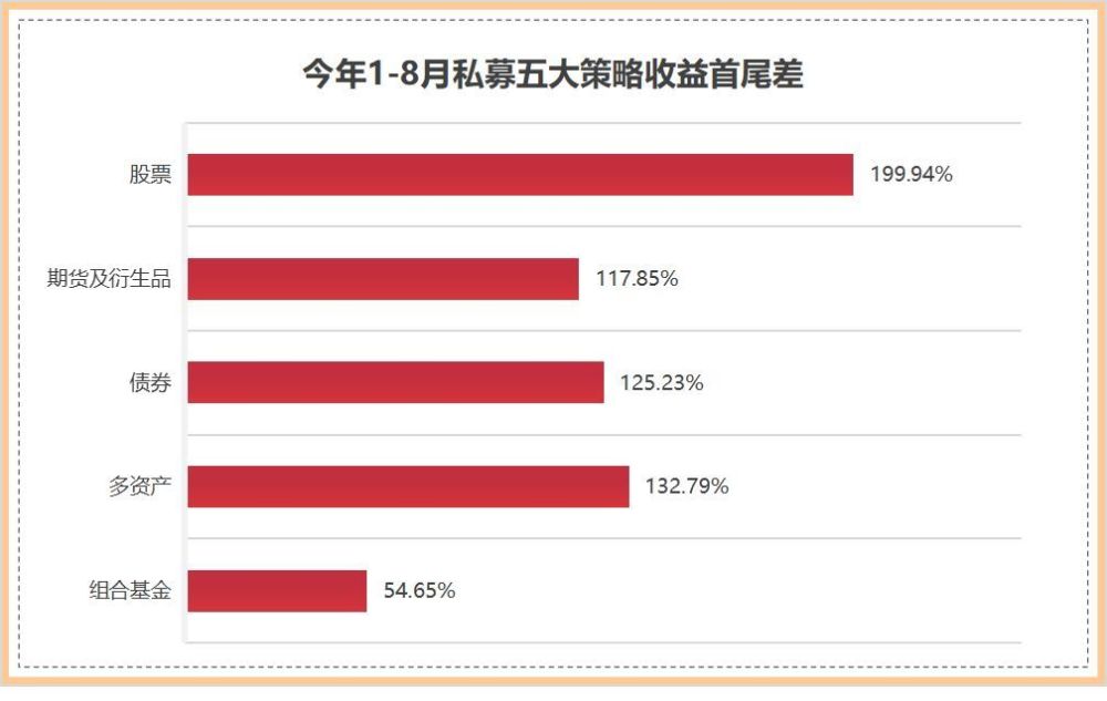 虽然8月的市场有种“波澜不惊”的感觉,但私募机构之间的竞争依旧激烈。据私募排排网不完全统计,截至2022年8月,有业绩更新的1630家股票策略私募机构的年内策略收益首尾差达到了199.94%,是五大策略中最高的,一定程度上显示出竞争的激烈程度,也凸显出收益的两极分化。