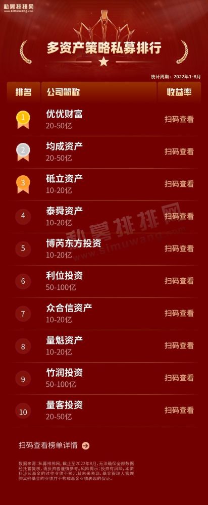砥立资产是该组的冠军,今年以来的策略收益达到***%,其也是多资产策略榜上的第三名。白鹭资管和玄元投资是所有榜单中唯二上榜的百亿私募。