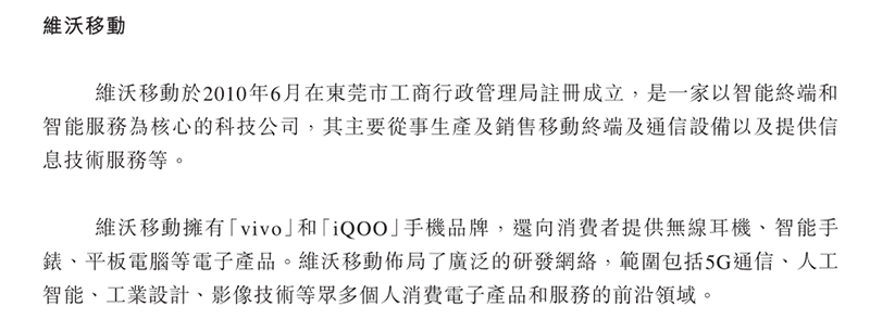 vivo主要从事生产及销售移动终端、通信设备,以及提供信息技术服务等,拥有手机品牌vivo和iQOO,还提供无线耳机、智能手表、平板计算机等电子产品。