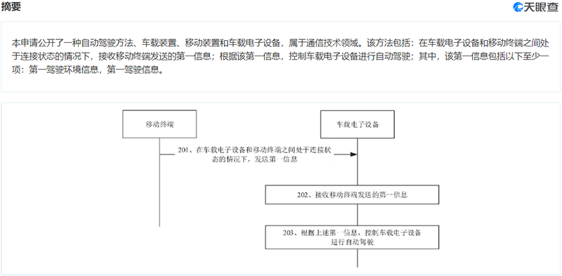 天眼查显示,该专利属于通信技术领域,在车载电子设备和移动终端处于连接状态的情况下,接收移动终端发送的第一信息,控制车载电子设备进行自动驾驶。