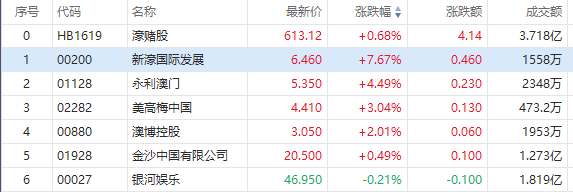 9月27日消息,港股博彩股今日涨势延续,新濠国际发展涨超7%,永利澳门涨4.49%,美高梅中国涨3.04%,奥博控股、银河娱乐跟涨。