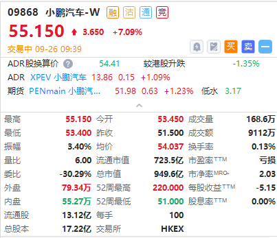 获控股股东增持ADS,小鹏汽车(09868)盘前高开3.79%,现涨超7%。