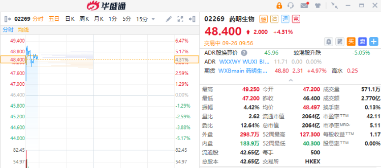 药明生物(02269)盘初活跃,升约5%。截至发稿,药明生物涨4.53%,成交额2.77亿港元。