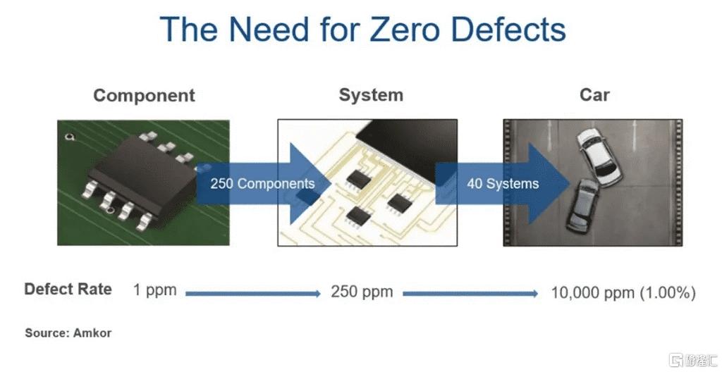 对汽车芯片“零缺陷”的追逐成为行业的共同目标。汽车行业正在降低芯片缺陷的可接受水平,缺陷率过去的衡量单位为百万分之一 (ppm) ,而现在的衡量单位为十亿分之一(ppb)。据Amkor的分析,如果每辆汽车有大约40个电子系统,而每个系统有大约250个半导体元件,那么元件层面即使1ppm(百万分之一)的缺陷率也会导致汽车整体的缺陷率陡增至10,000ppm (1%),这个数字对于安全关键型电子器件来说是过高的。