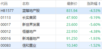 华盛资讯9月26日消息,香港地产股今日集体重挫,截至发稿,长实集团跌9.19%,报47.9港元;九龙仓集团跌5.74%,报25.45港元;长和跌7%,报43.85港元;九龙仓置业跌3.45%,报36.35港元;新世界发展跌超5%,恒基地产跌超4%。