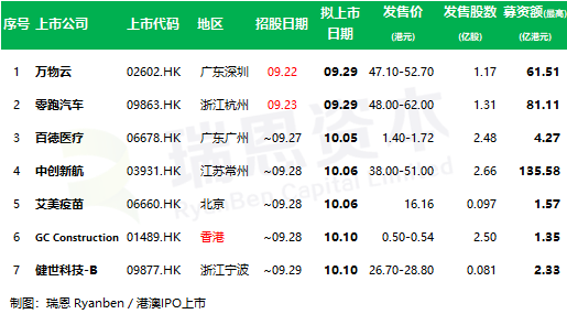 同时万物云(02602.HK)、零跑汽车(09863.HK)这2家已结束招股,预计将在9月29日上市,此外还有5家包括百德医疗(06678.HK)、中创新航(03931.HK)、艾美疫苗(06660.HK)、GC Construction(01489.HK)、健世科技-B(09877.HK)等5家于仍在招股中,预计将于10月上市挂牌上市,目前看至少有7家预期将于未来两周在港交所IPO。