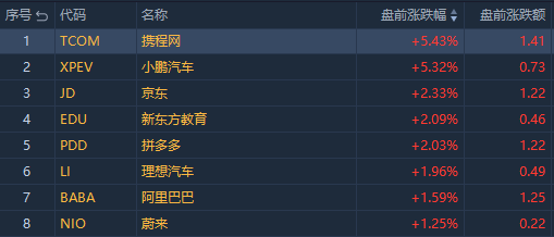 热门中概股盘前走高,携程 $TCOM 涨5.43%,小鹏汽车 $XPEV 涨5.32%,京东 $JD 涨2.33%,拼多多 $PDD 涨2.03%。